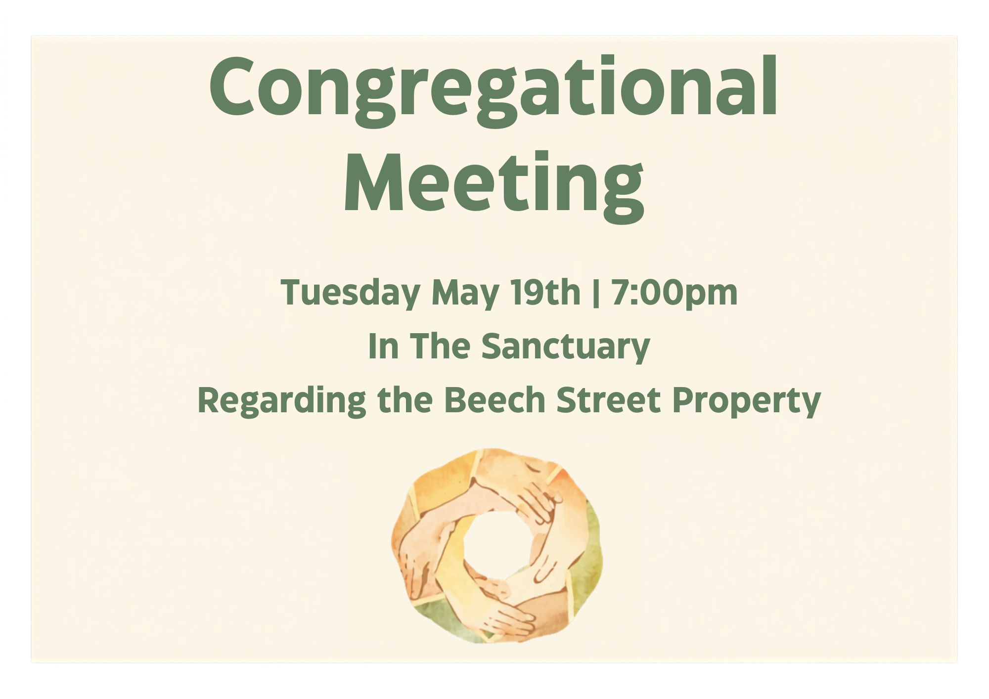 There will be a congregation meeting on Tuesday May 19th at 7pm to discuss theBeech Street Property. You are invited to make a 3 minute presentation regarding how you envision the use of that space.
